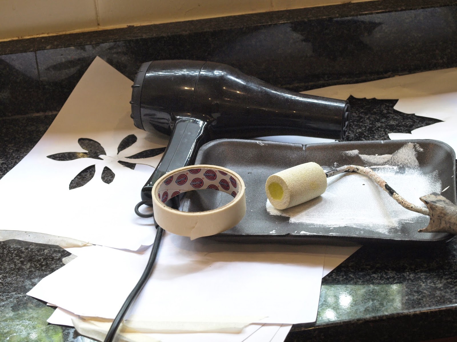I only needed a tiny bit of white paint. I used a small foam roller, with a thin layer of paint. I rolled the roller in the paint on a recycled polystyrene tray to distribute the paint evenly, then carefully rolled the paint in the stencil gap. I had to be particulary careful with the fern stencil. - I turned some of the stencils over for their next printing in order to get the leaf facing in a different direction. I used my hairdryer to dry any paint on the stencil, which may have marked the wall.