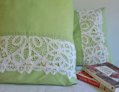 The pillows on the bed were made with sheeting and a vintage lace tray cloth, which I cut in half and inserted!
